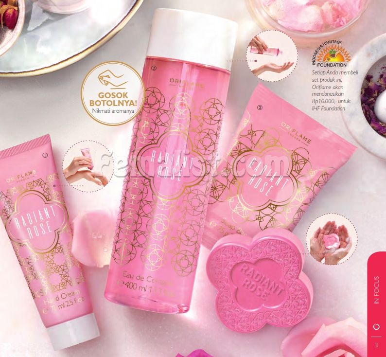 - Promo pembelian Radian Rose Set hanya Rp 259.000,- dengan syarat belanja Rp 399.000,- harga katalog. Cek di halaman 2.