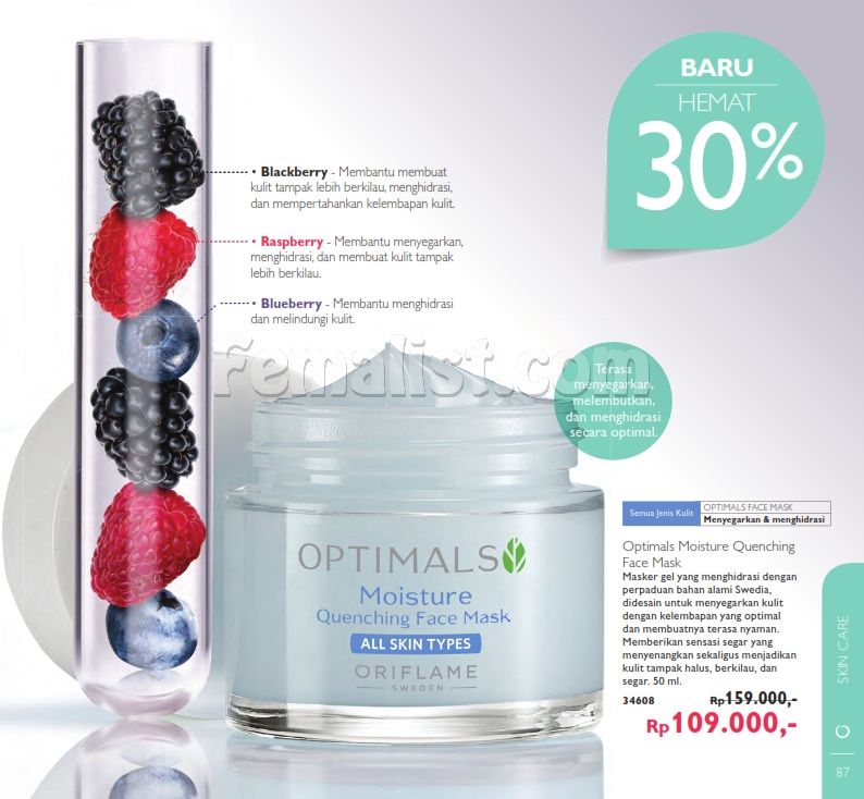 - Hemat 30% produk baru Optimals Moisture Quenching face mask di halaman 87.