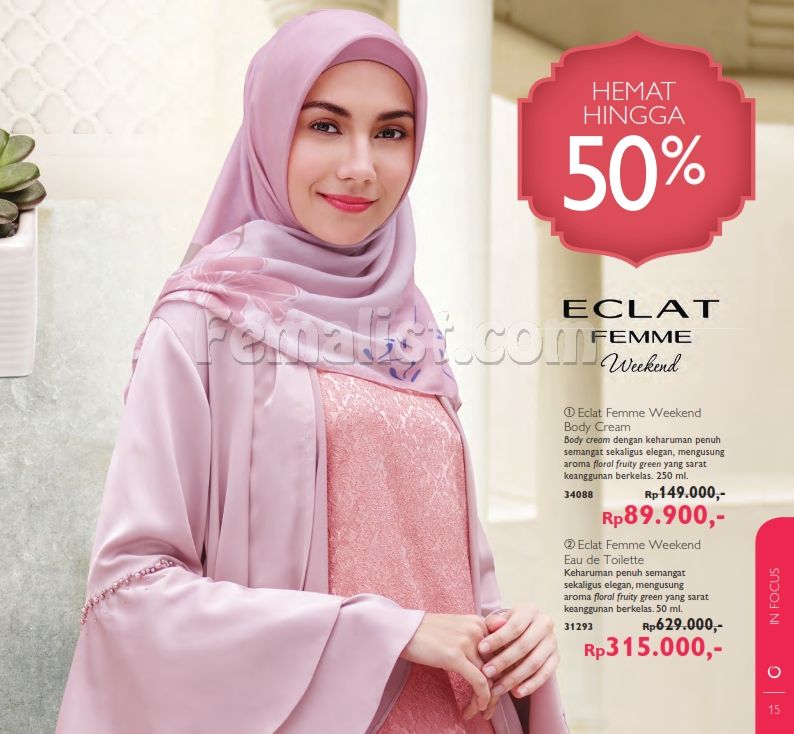 - Potongan harga hingga 50% untuk Eclat Femme Weekend Body cream dan edt di halaman 15.